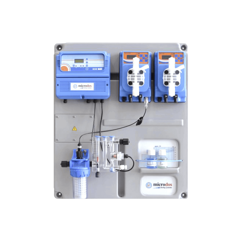 POOL GOLD professzionális pH és Cl (klór) mérő és adagoló berendezés, PVC fali panel elektromos kialakítással.