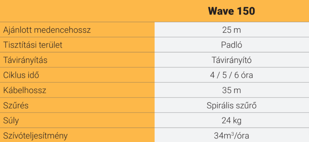 Dolphin WAVE 150 hatékony, automatizált medencetisztító robot a kis- és közepes méretű közületi medencékhez, 25 méteres medence hosszúságig. Kategóriájában a leghatékonyabb padlótisztítási képességekkel rendelkezik.
