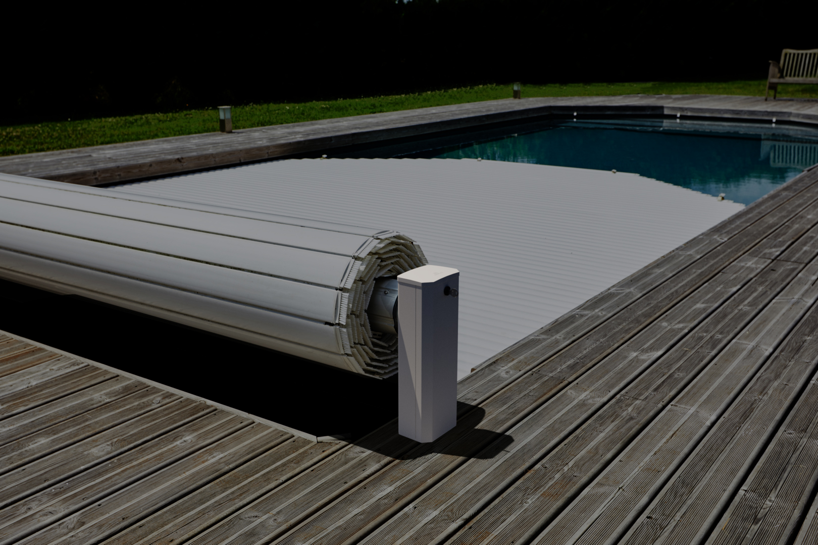Az OPEN Néo medence redőny ideális közepes és nagyobb méretű medencékhez, ahol fontos a kényelem, az esztétika és az automata működés.