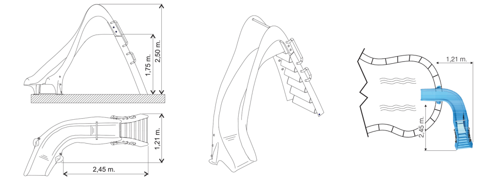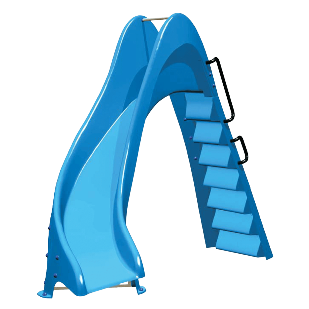 A biztonsági korlátból kijövő vízköpők felelnek a csúszdarész nedvesen tartásáért. Csúszásmentes lépcsőfokokkal és alumínium fogantyúkkal ellátott lépcsők.