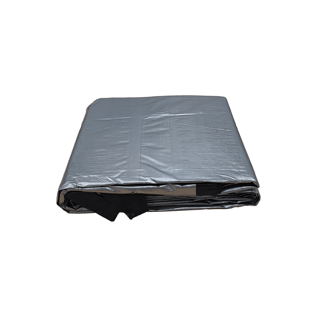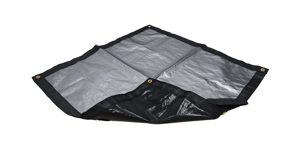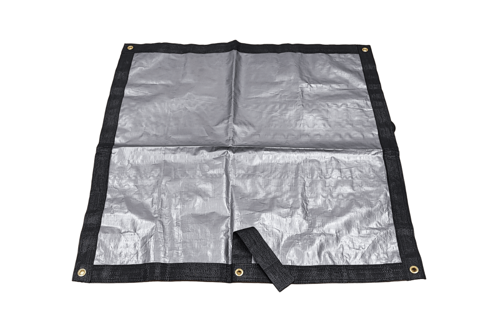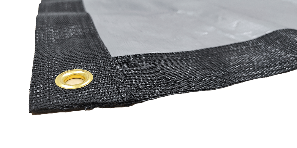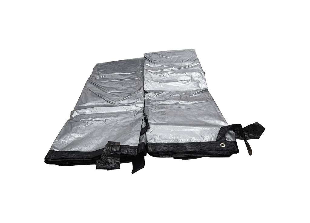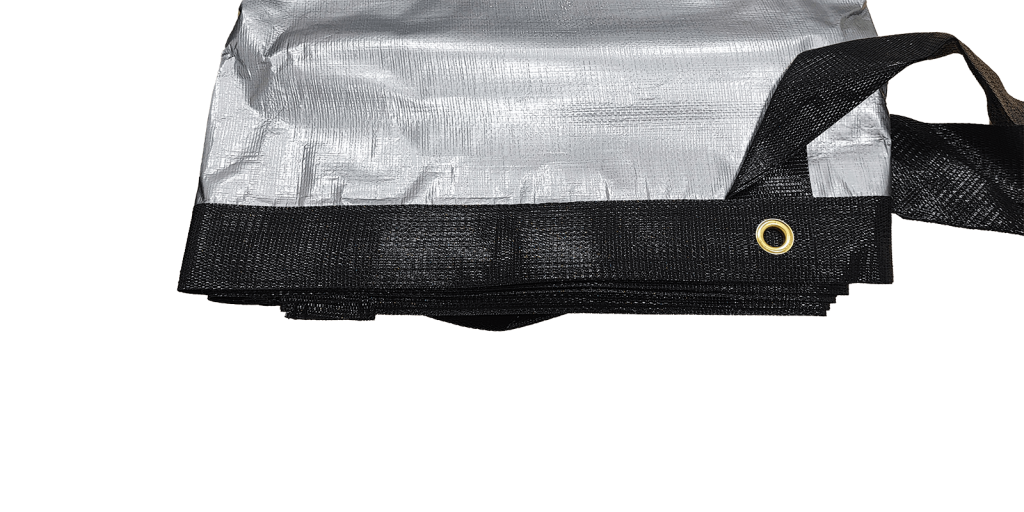 Téglalap alakú, laminált polietilén szőtt fólia, poliészter erősítéssel a széleken. Magas élettartam, kiváló szakítószilárdság és tartósság jellemzi.