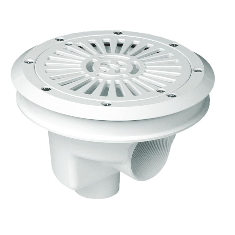 A padlóürítő anyaga fehér ABS, oldalán 2”, alul 1 ½" belsőmenetes csatlakozással.
