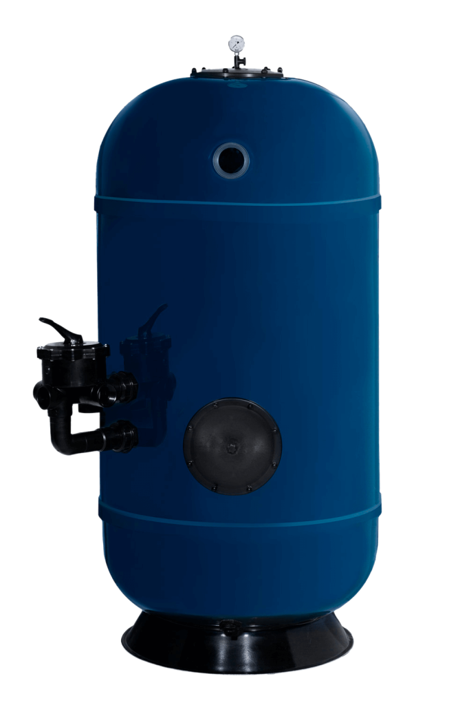 Szűrőtartály közületi medencékhez, iparági szabványoknak megfelelő kialakítás, üvegszállal erősített tartály, UV sugárzás elleni védőréteg, kollektor karos kialakítás.