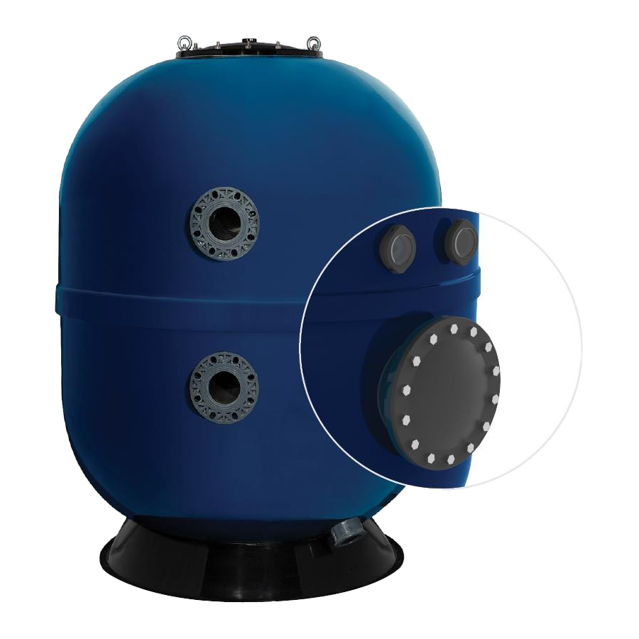 Üvegszállal erősített szűrőtartály közületi medencékhez, UV sugárzás elleni védőréteg, szűrőlapos kialakítás, oldalsó búvónyílás. 400mm átmérőjű tartály és oldalsó fedél.