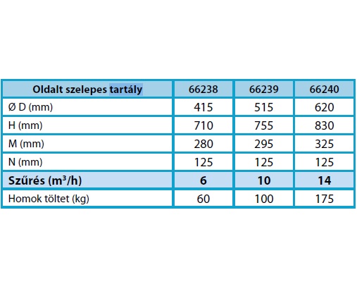 A tekercselt szűrőtartály üvegszállal erősített poliészterből készült, RAL6027 színben. Alaplapja és fedele PP anyagú. A tető átlátszó, bilinccsel van rögzítve. A berendezés nyomásmérő órával van felszerelve. Maximális üzemi nyomása 2,5 kg/cm2, és szűrési teljesítménye 50 m3/h/m2.