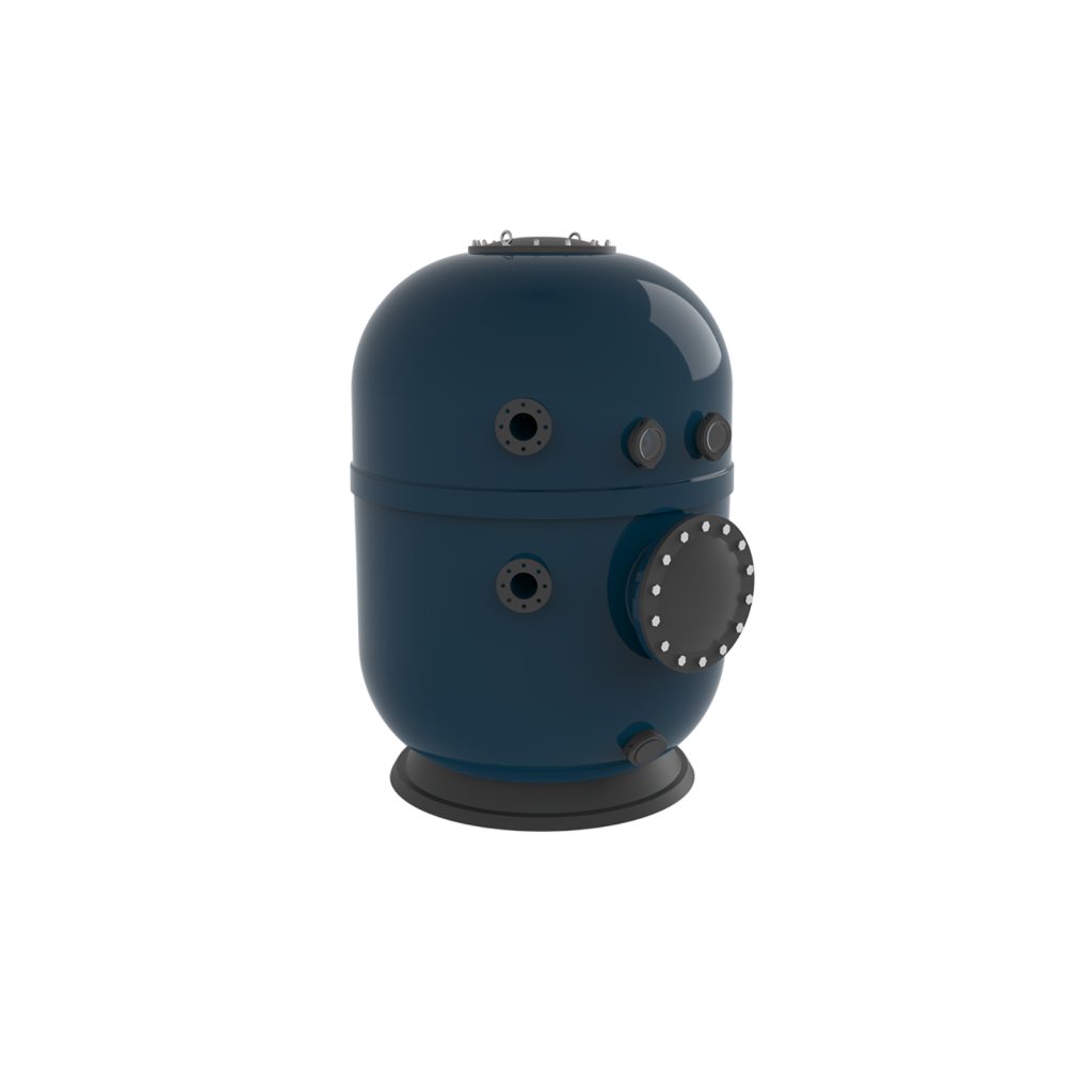 Üvegszál erősített szűrőtartály közületi medencékhez, iparági szabványoknak megfelelő kialakítás, UV sugárzás elleni védőréteg, kollektor karos kialakítás. Üvegszállal erősített, 400mm átmérőjű tartályfedél és oldalsó fedél.
