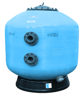 Üvegszál erősítésű laminált poliészter szűrőtartály közületi medencékhez, Rendelhető 400mm-es oldalbúvó nyílással és kémlelő ablakkal. Tartozéka a nyomásmérő óra és légtelenítőszelep. A szűrőágy kollektor karokkal van felszerelve.