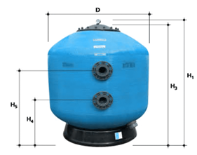 Üvegszál erősítésű laminált poliészter szűrőtartály közületi medencékhez, Rendelhető 400mm-es oldalbúvó nyílással és kémlelő ablakkal. Tartozéka a nyomásmérő óra és légtelenítőszelep. A szűrőágy kollektor karokkal van felszerelve.