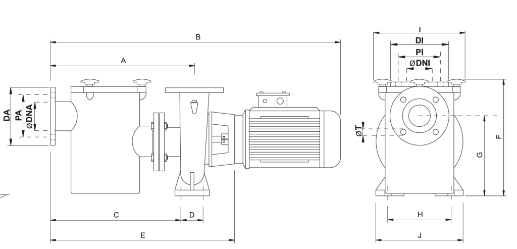 Nagy teljesítményű szivattyú közületi használatra. Egy nagy teljesítményű centrifugál szivattyú, amelynek bemenetéhez egy előszűrőt csatlakoztattak, így ezek ideális szivattyúk nagy úszómedencék szűrőegységeihez.